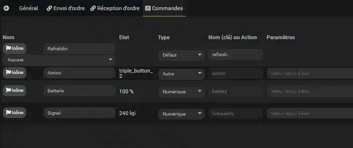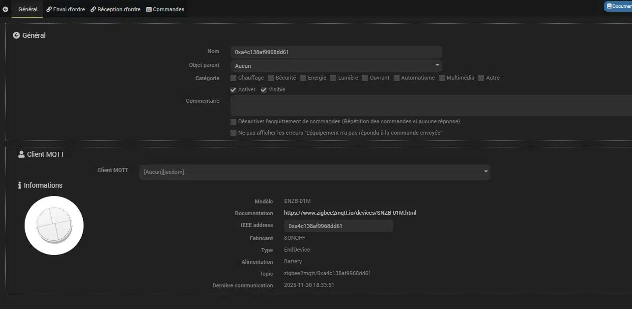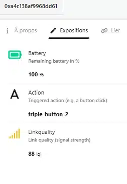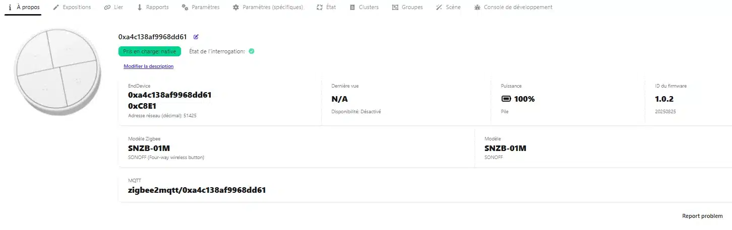 C’est clairement l’intégration la plus complète et la plus fluide. L’appairage se fait en quelques secondes : une pression de 5 secondes sur le bouton reset à l’arrière lance le mode inclusion. Zigbee2MQTT reconnaît automatiquement le modèle, et remonte les 16 actions avec des intitulés explicites comme single_button_1, long_button_2, etc. Aucune configuration additionnelle requise. Vous pouvez alors l’utiliser dans vos automatisations Home Assistant ou Jeedom via MQTT.