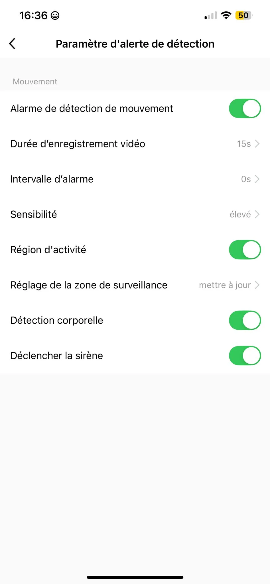 Detection sensitivity, region, and recording duration are customizable. Alerts can also trigger the built-in siren — but there’s no scheduling feature to limit detections by time of day.